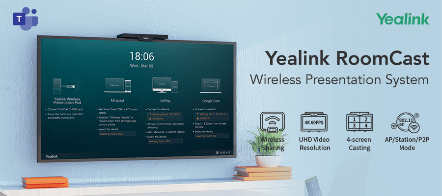 Yealink RoomCast er et trådløst presentasjonssystem som fungerer med Yealink Wireless Presentation Pod, Miracast, AirPlay og Google Cast. Det realiserer en 4K ultra HD multi-sharing-opplevelse og støtter samarbeidsfunksjoner, inkludert whiteboard, merknad og intuitiv fjernkontroll.